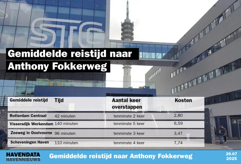 Hieronder een Havendata tabel met daarin de reistijd, het aantal keren dat men moet overstappen en de reiskosten vanaf een aantal locaties naar de Anthony Fokkerweg vanuit Rotterdam Centraal, de Vissersdijk in Werkendam, de Zeeweg in Oostvoorne en de Scheveningse Haven in Den Haag.
